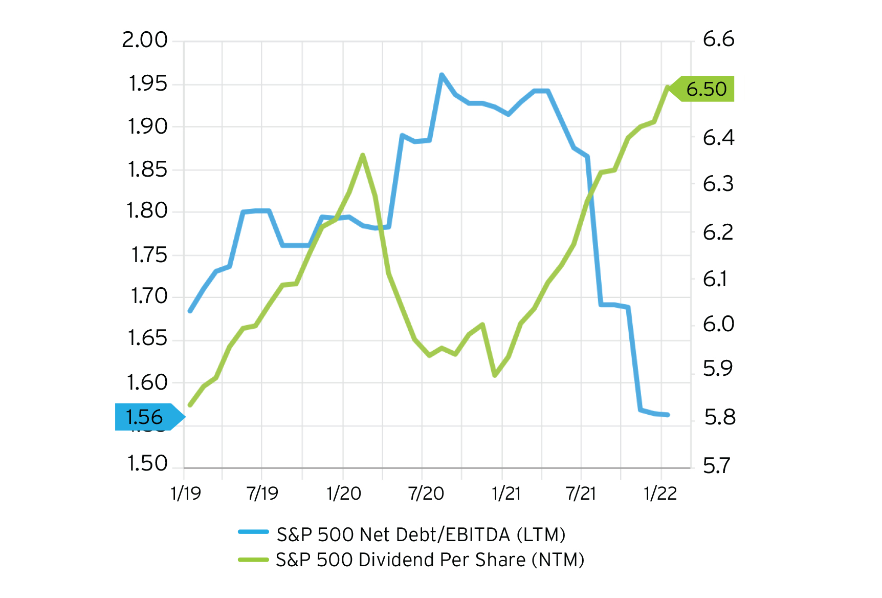 Paying down debt was a notable trend in 2021, and now companies are positioned with stronger balance sheets for future growth. Paying down debt and returning cash to shareholders are not mutually exclusive — UPS ( UPS) improved its debt-to-EBITDA ratio from 3.6x in 2020 to 1.9x in 2021 by paying down debt, while returning over $3.9 billion of cash to shareholders. Higher 2021 free cash flow enabled Chevron to pay down debt, increase its dividend and engage in share buybacks throughout the year.