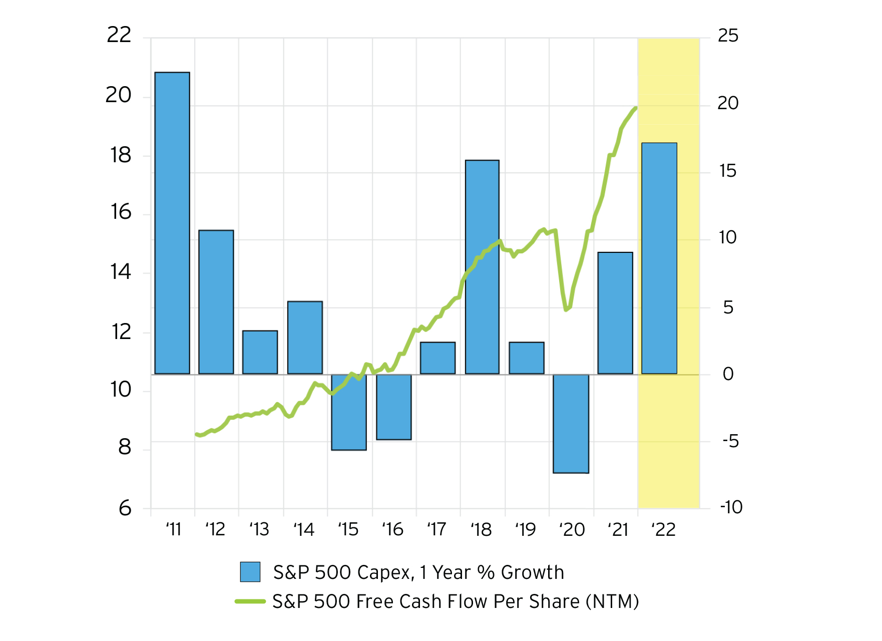 An effect of higher pricing and lower inventory builds is that free cash flow has grown significantly across industries. McDonald’s (MCD) grew free cash flow +25% vs. 2019, while Chevron (CVX) generated free cash flow 25% higher than their previous annual high. Companies are using free cash flow to improve balance sheets, return cash to shareholders and invest in capex. We welcome a strong capex cycle as it will help overall economic growth.